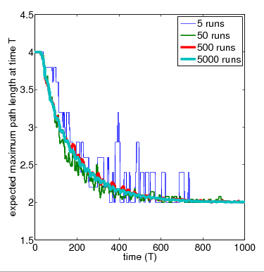 For the purposes of comparison, below we have included the average results over 5, 50, 500 and 5,000 simulation runs for the network of 4 nodes obtained with PRISM's discrete-event simulation engine.