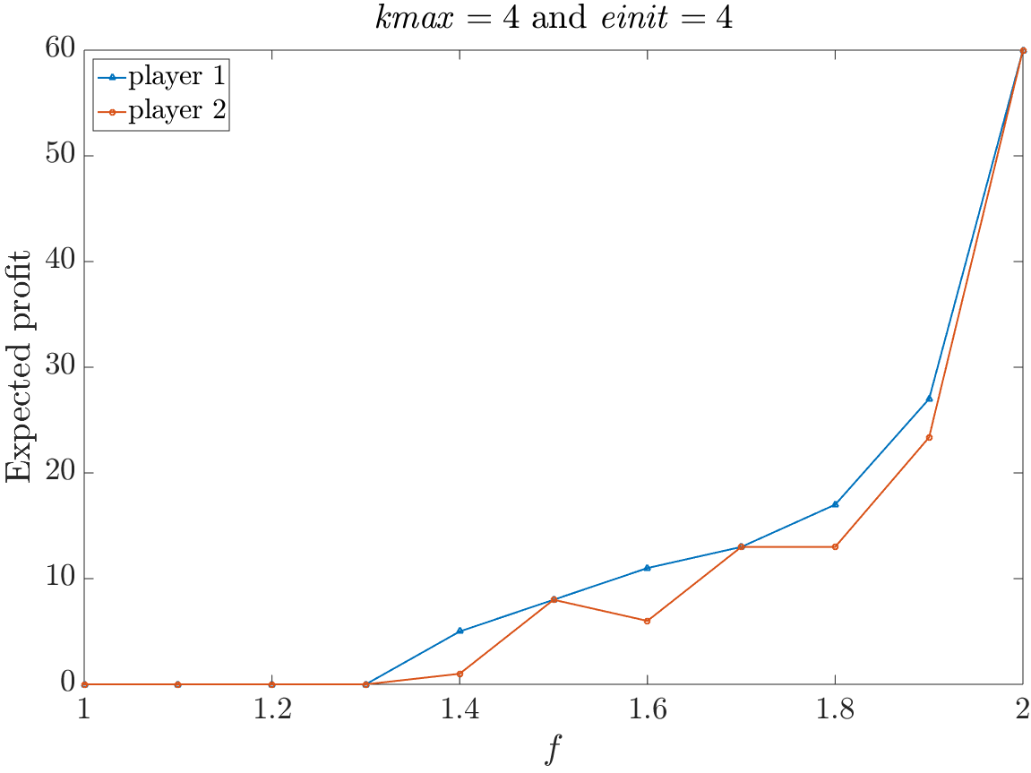 We consider the following two non-zero properties where each player tries to maximise their expected profit either after all rounds have been completed or at the end of a specific round. We will fix the cap on capital held by each player at emax=100 and the initial endowment for each player at einit=4.