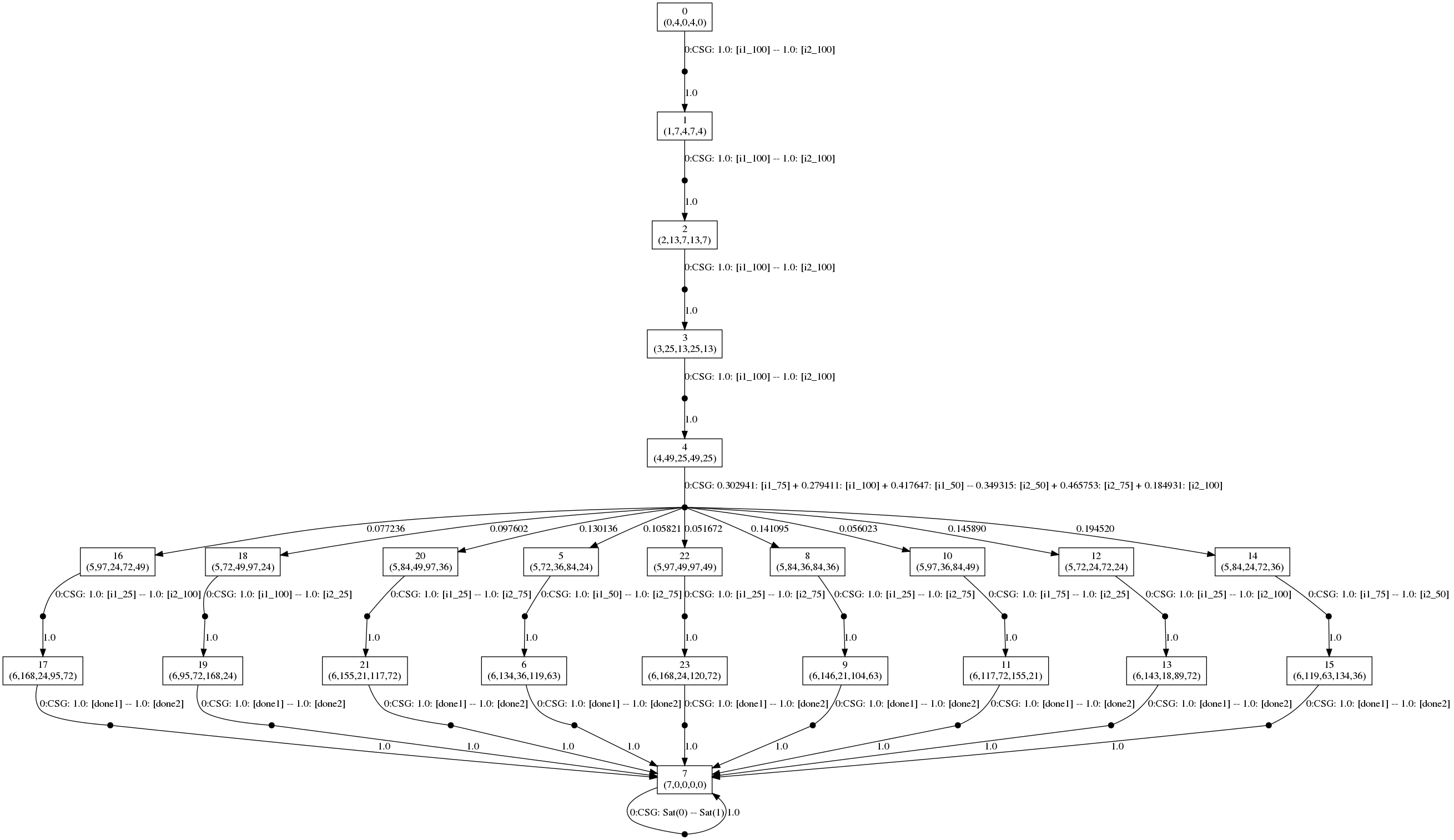 In the graph, the vertices correspond to the states of the game and are labelled with tuples corresponding to the values of the variables of the model: (k,c1,s1,c2,s2). The edges of the graph are labelled CSG followed by the choices for the two players (the probabilities of choosing available actions) with the choices for the different players separated by --. The graph is generated by running the command: